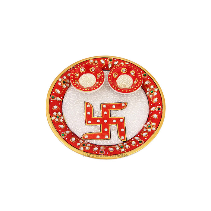 Pooja Thali in marble with Swastik in meena Painted by Handicrafts Paradise